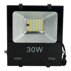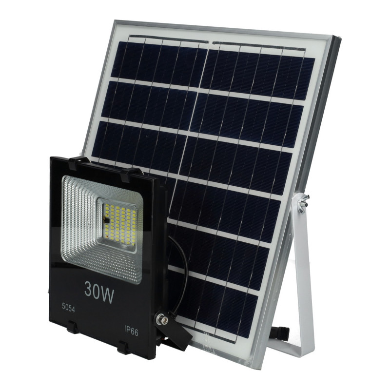 Slim 30W solar LED floodlight for indoor and outdoor use. IP65 waterproof, substantial energy saving and high light output, cool white light, with 2000 lumens.