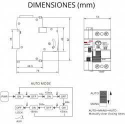 In AUTO mode, this device allows the voltage to be automatically reconnected after tripping. It has 3 preset resets in 10, 60 and 300 seconds respectively. If the circuit breaker is tripped a fourth time in less than 15 minutes, it will be blocked until it is manually re-armed. It also has a manual mode in which automatic rearming is disabled.