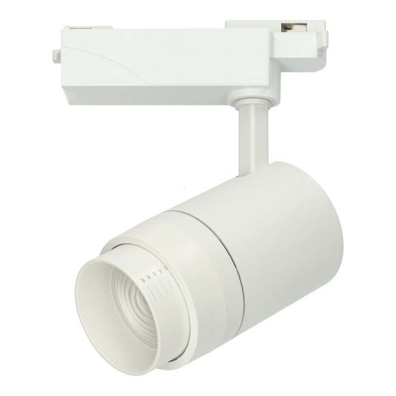 El foco carril LED con ángulo ajustable de 30W está diseñado en aluminio y policarbonato con acabado en color blanco. Tiene un diseño moderno y compacto que la convierte en una luminaria perfecta para instalaciones tanto en ambientes domésticos, como espacios más comerciales. Dentro del ámbito comercial es ideal para iluminación en tiendas, escaparates, exposiciones, supermercados, hoteles o restaurantes. Destaca por su fácil instalación y su máxima eficiencia energética con un ahorro del 80% con respecto a las lámparas convencionales. Incorpora una óptica que permite regular el ángulo del haz de luz desde 15 hasta 60 grados.
