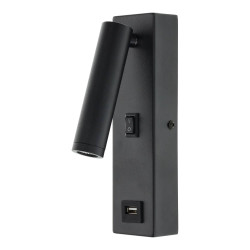 Aplique de pared en aluminio con acabado en color negro con un punto de luz de lectura orientable de 3W de potencia y una dispersión lumínica de 25°. Dispone además de un puerto de carga USB de 2A que permite cargar cualquier dispositivo electrónico. Es ideal para su instalación como luz de lectura para dormitorio, aplique cabecero para cama, en salones, escritorios, hoteles, apartamentos etc. La luz no es regulable.