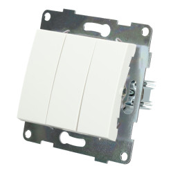 Interruptor triple de un elemento empotrable, disponible en tres colores diferentes: blanco, negro o plata. Es un mecanismo apto para ser utilizado con iluminación LED, sin provocar parpadeos molestos en las bombillas.