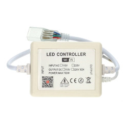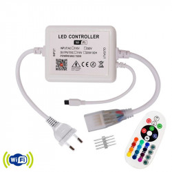 Kit enchufe controlador para tiras led 220V RGB, con control remoto por infrarrojos y función WIFI. Soporta hasta 50 m de tira led RGB 220V (14W/m). Permite gestionar y controlar fácilmente las tiras gracias al mando a distancia de 24 botones. Con este controlador se puede ajustar el brillo, intensidad, color, velocidad, modo de funcionamiento y efectos. Es ideal para ambientes interiores que requieran una iluminación dinámica y personalizable.