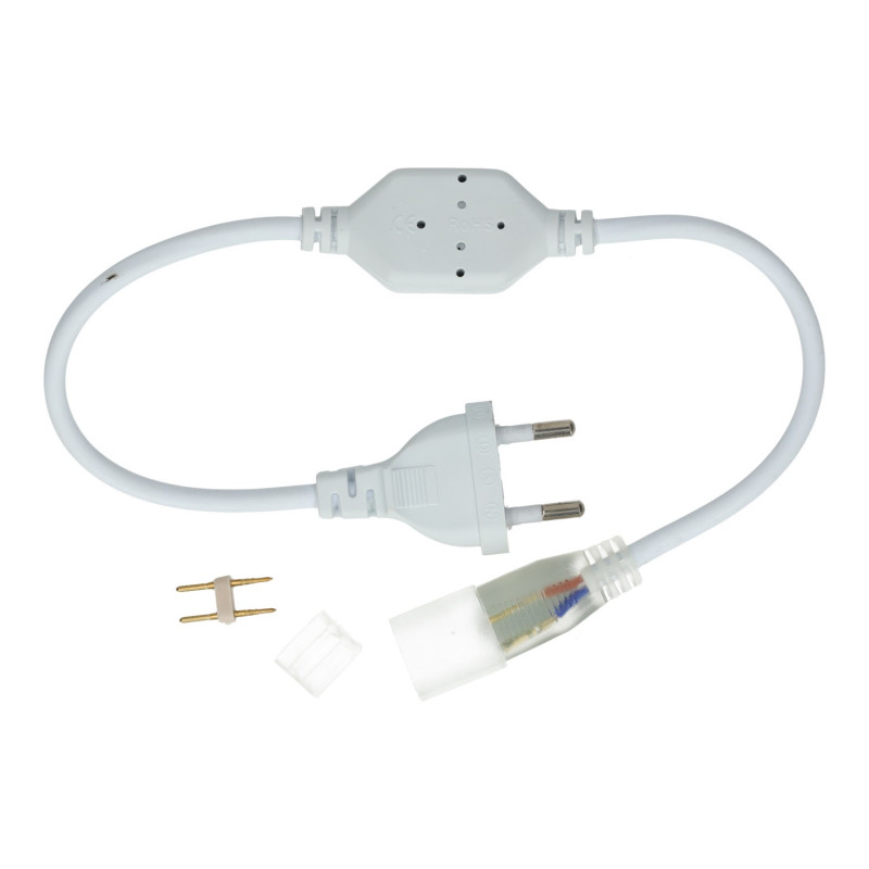 El kit enchufe para tiras NEÓN FLEX de 220V, soporta hasta 50 m de tira led. Permite conectar de manera directa la tira led de neón a la red, sin necesidad de transformador ni de ningún dispositivo adicional.