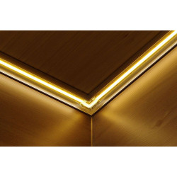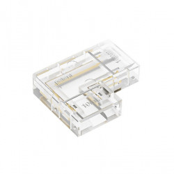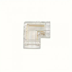 Conector de empalme para esquinas, diseñado para ser utilizado con tiras LED COB monocolor de 12V o 24V. Es un conector transparente que no interfiere en la continuidad de la luz y permite la unión de forma rápida y sencilla de dos tiras LED COB de 10 mm de ancho.