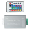 Controlador y mando a distancia (infrarrojo) para tiras led RGB de 12-24V hasta 30A. El controlador solo conserva la memoria si se apaga mediante el mando a distancia, no mantiene la memoria si se apaga mediante corte de tensión.
