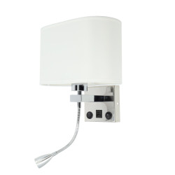Applique murale en aluminium, avec abat-jour en tissu blanc. Elle dispose d'un point lumineux LED orientable de 1 W pour la lecture et d'une douille à vis E27 pour l'éclairage général (ampoule à acheter séparément).