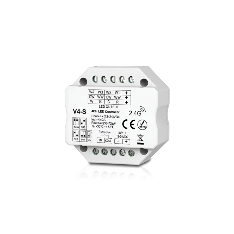Variateur DC, pour une gamme de 12 à 24V. Idéal pour la gradation de bandes, d'ampoules et de tout autre luminaire fonctionnant en courant continu. Il peut être commandé par bouton-poussoir ou par une télécommande à radiofréquence de 2,4 GHz. Ce dispositif convient pour la gradation de sources lumineuses unicolores, CCT, RGB et RGBW.