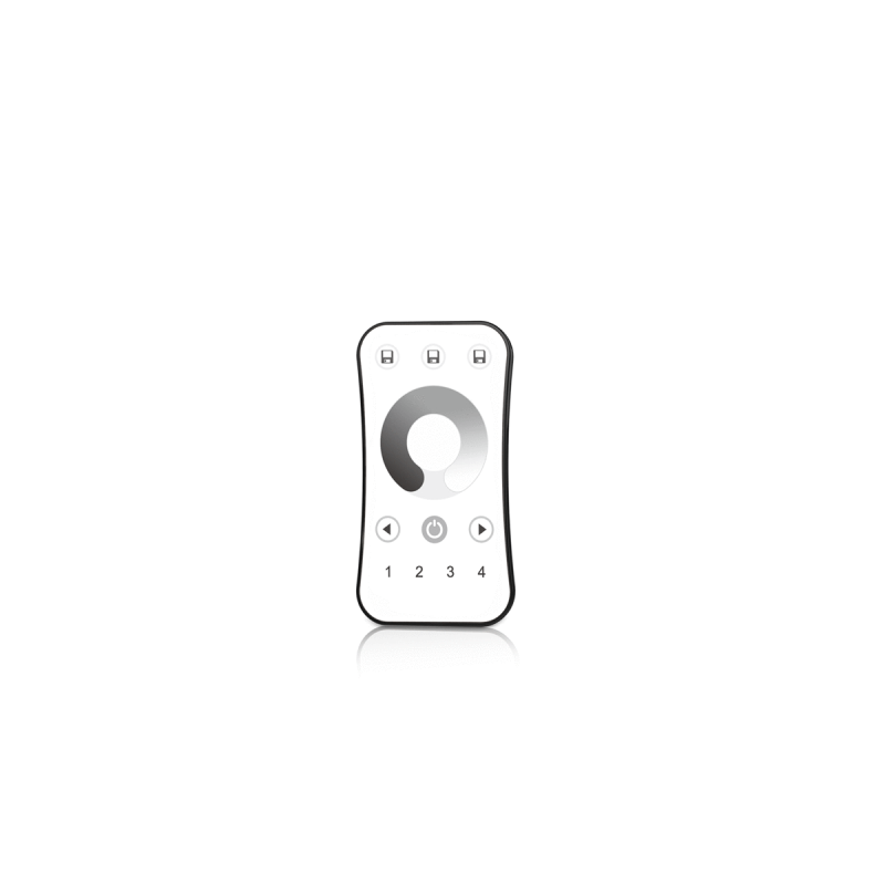 Télécommande à radiofréquence (2,4 GHz) pour gradateurs LED unicolores. Elle permet de varier l'intensité lumineuse, d'allumer et d'éteindre l'éclairage et de mémoriser des scènes personnalisées. Elle est compatible avec nos variateurs RF pour tablettes et avec tout récepteur radiofréquence universel de 2,4 GHz. Il peut gérer jusqu'à 4 zones indépendamment.