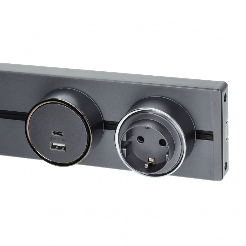 Rail pour montage en surface, couleur gris métallique. Permet d'accoupler et de désaccoupler facilement des prises de tous types, ainsi que de déplacer les prises sur toute la longueur du rail. Il est donc idéal pour les endroits où le nombre et/ou le type de prises disponibles doivent être modifiés de temps à autre.