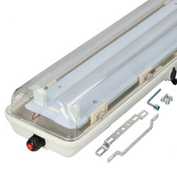 Schermo impermeabile ATEX con capacità per due tubi LED T8 da 60 cm. Con protezione contro le atmosfere che possono causare esplosioni.