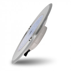 Lampada per piscina da 18W a luce calda, design extrapiatto per installazione a incasso. Realizzata in acciaio inox 316.