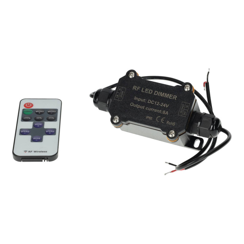 Controller LED IP65 monocolore e telecomando. Compatibile con strisce LED a 12 e 24 V.