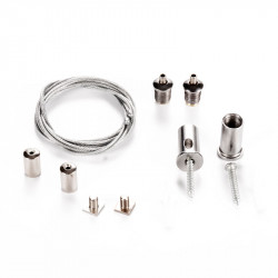 Pode ser utilizado com o nosso perfil rectangular 66x35x2000mm, basta aparafusar as duas guarnições ao tecto, passar o cabo de aço com a sua rolha, e aparafusar o pino do cabo ao perfil. Este contém um mecanismo que permite o ajuste da altura.