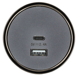 Tomada com duas tomadas USB (A+C) para instalação em calha linear, com acabamento em cinzento. Ideal para alimentar ou carregar pequenos aparelhos eléctricos e electrónicos.