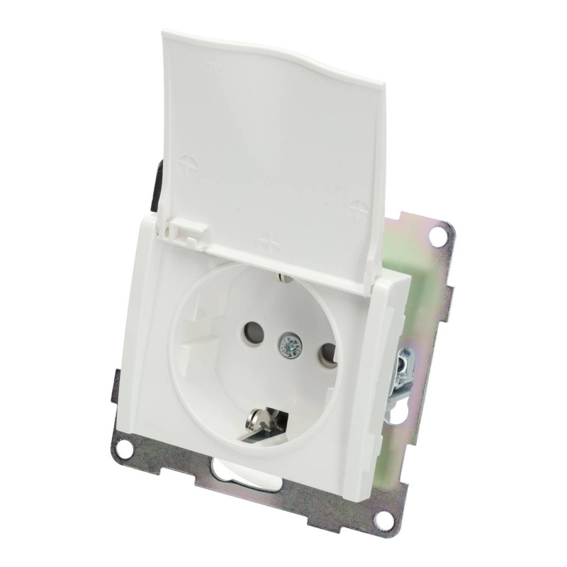 Tomada schuko de encastrar, disponível em prata ou branco.
