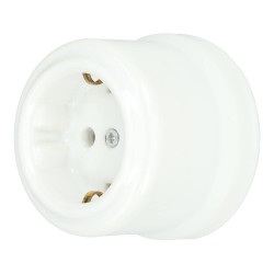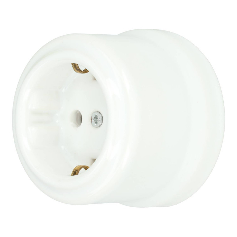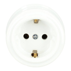 Tomada Schuko de porcelana em branco, preto e marfim, com dimensões de 64 x 49 mm.
