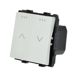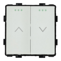 Interruptor de duas teclas para controlo de persianas, disponível em branco ou preto. Ao premir e manter premido um botão, a persiana sobe ou desce até que o botão seja premido ou o interrutor de limite seja atingido.